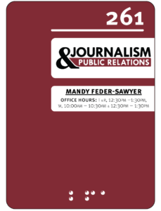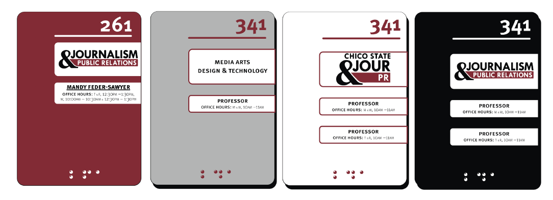 Using Adobe Illustrator, I wanted to have a layout for the office signs that was both visually appealing using the university colors and modular. So from looking at different types of office signs online I was inspired to create this where the department and professor names are printed on paper and can be swapped out of the sign every semester if information is changed.
